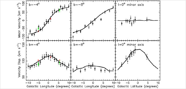 图1:银河系核球动力学模型与BRAVA巡天运动学数据的定量比较,二者吻合得非常好。与之相比,含有经典核球的模型不能很好地符合BRAVA观测数据(Shen et al. 2010)。
